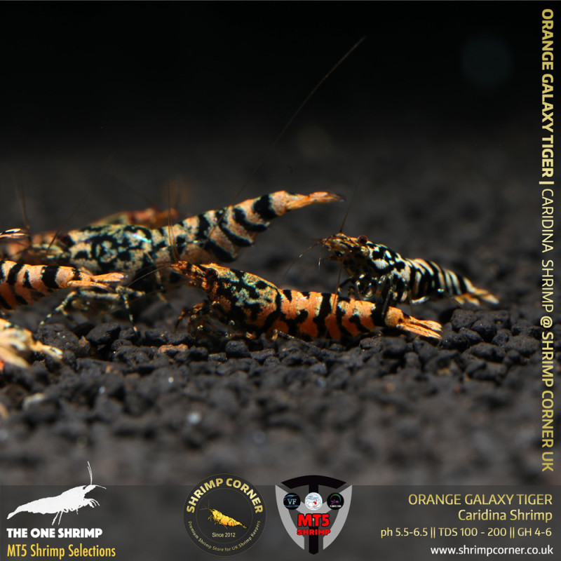 Orange Galaxy Tiger with 3-4 tail stripes. Patterns are vary - if you want to see the exact shrimp you are buying, please send us a message and we will sort you out.