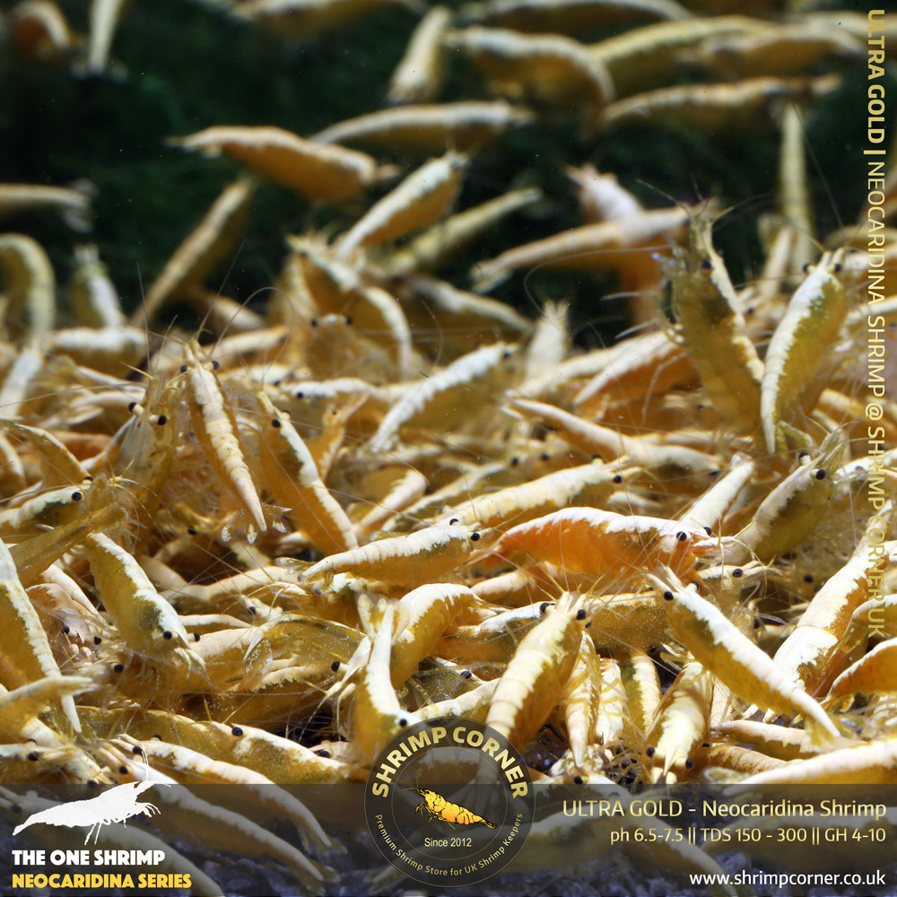 Another stunning variation of cherry shrimp is here at Shrimp Corner. Vibrant sandy looking gold bar colour, to dark orange colour. With golden backline too. These are selected breed from Taiwan Neocaridina shrimp breeders