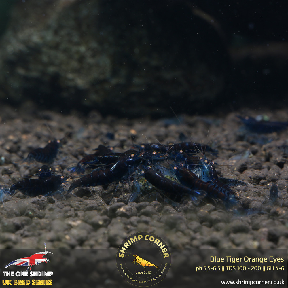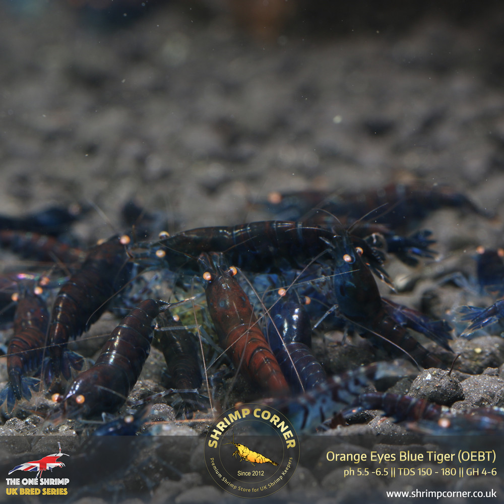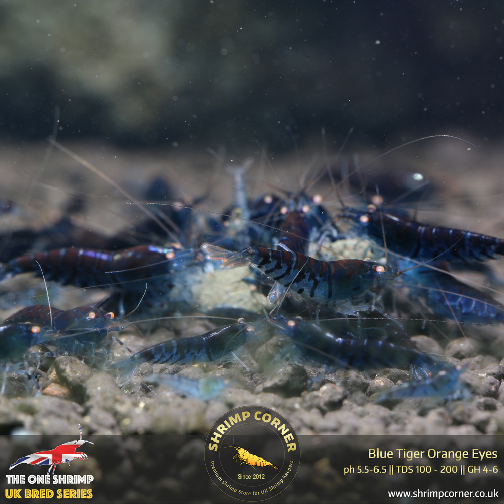 Classic Blue Tiger shrimp with Orange Eyes - some can grow to be RED RUSTY GRADE